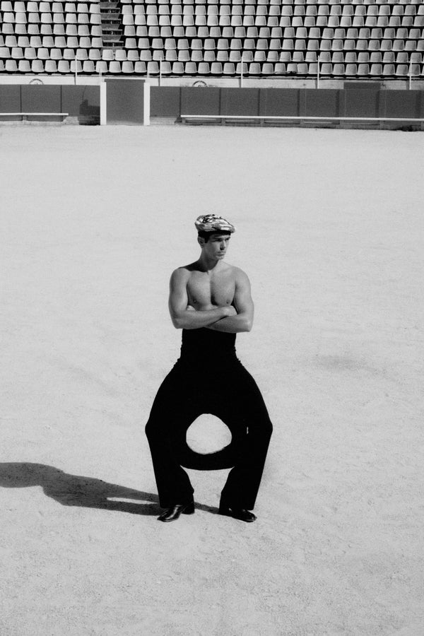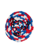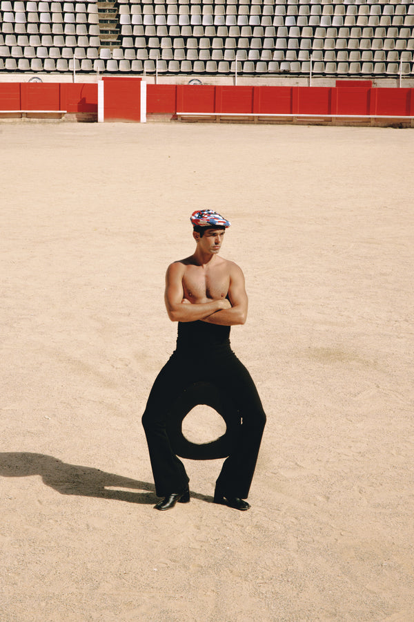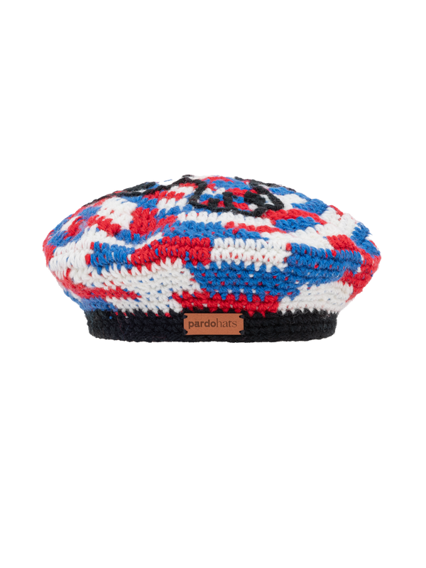 Crochet wool beret in a bold red, white, blue, and black mélange pattern, finished with an embroidered bird on top.