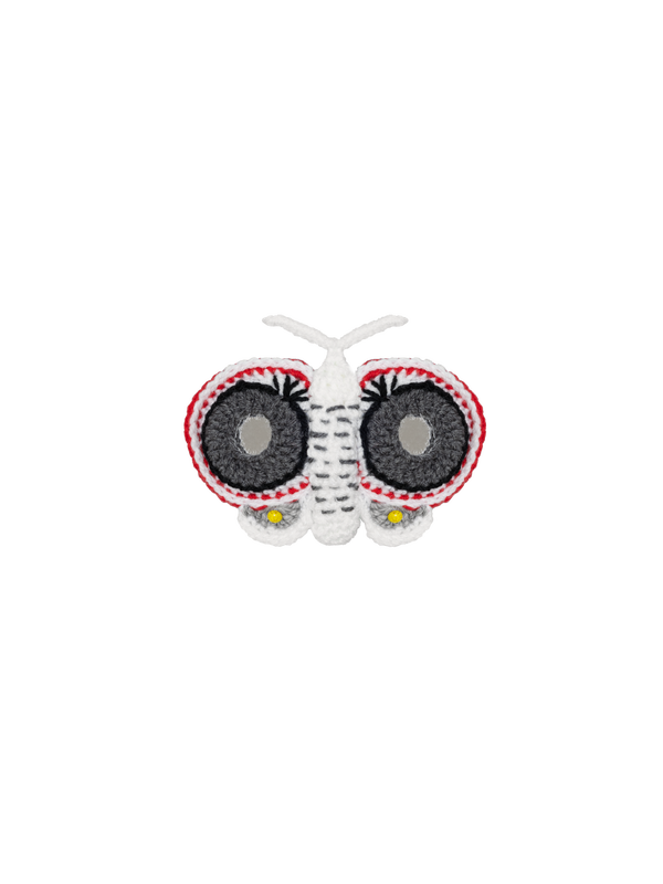 Wool butterfly-shaped hair clip with mirror details in striking white, black and red tones. Finished with top-grade vintage yellow beads.
