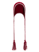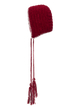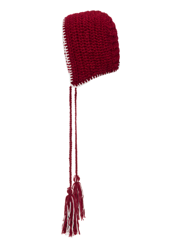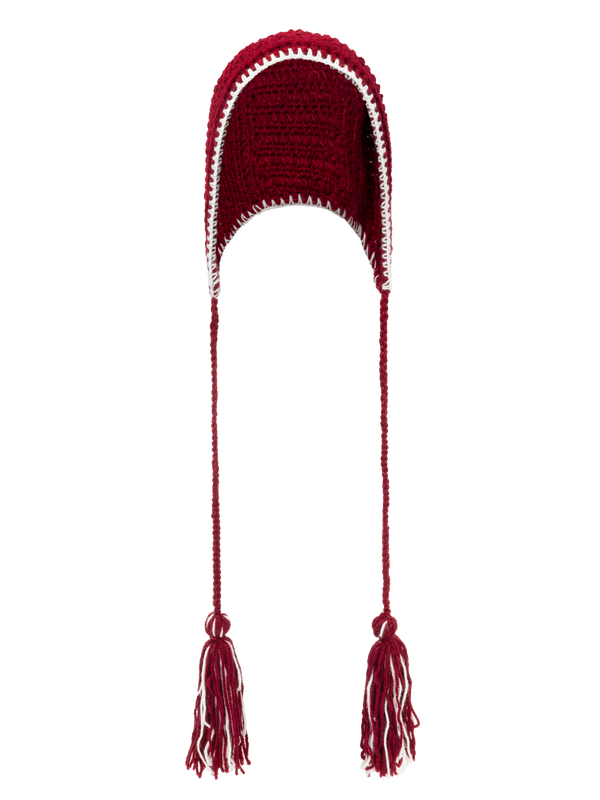 Andean-style hat in deep red with long earflaps, edged in white and finished with tassels.