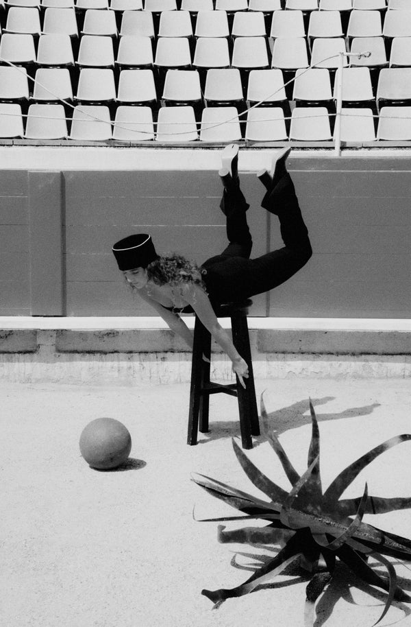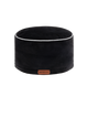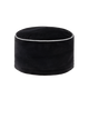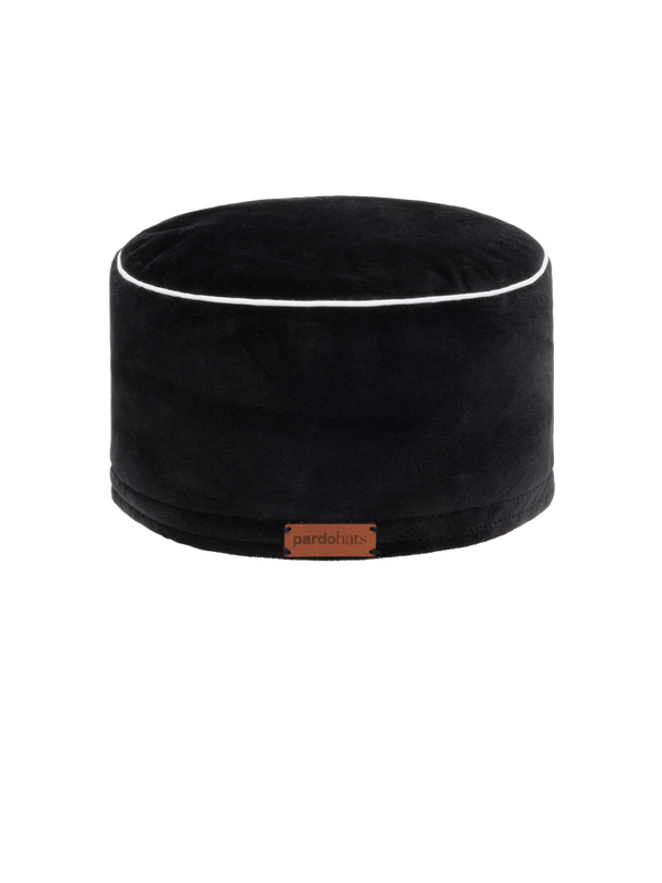 Classic fez hat in black velvet, highlighted with fine white piping for subtle contrast.