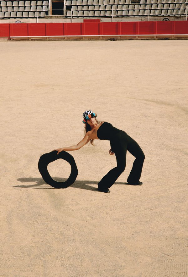 Crochet wool hat with a geometric black and white crown, framed by striped orange and turquoise brim.