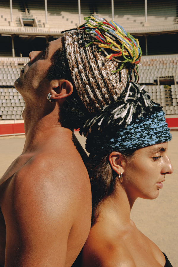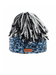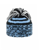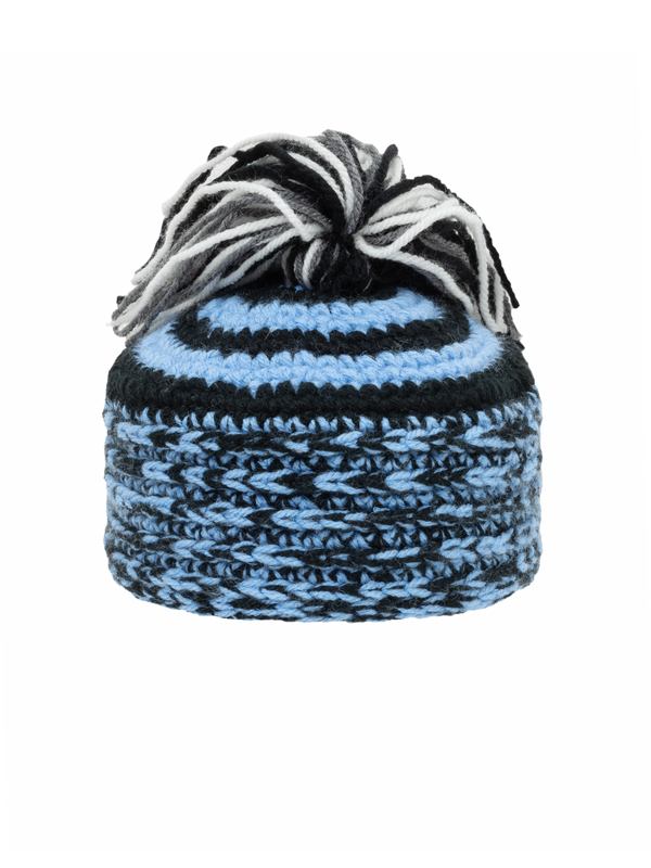 Crochet wool hat with black and blue stripes, topped with a large black and white pompom.