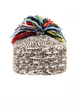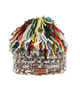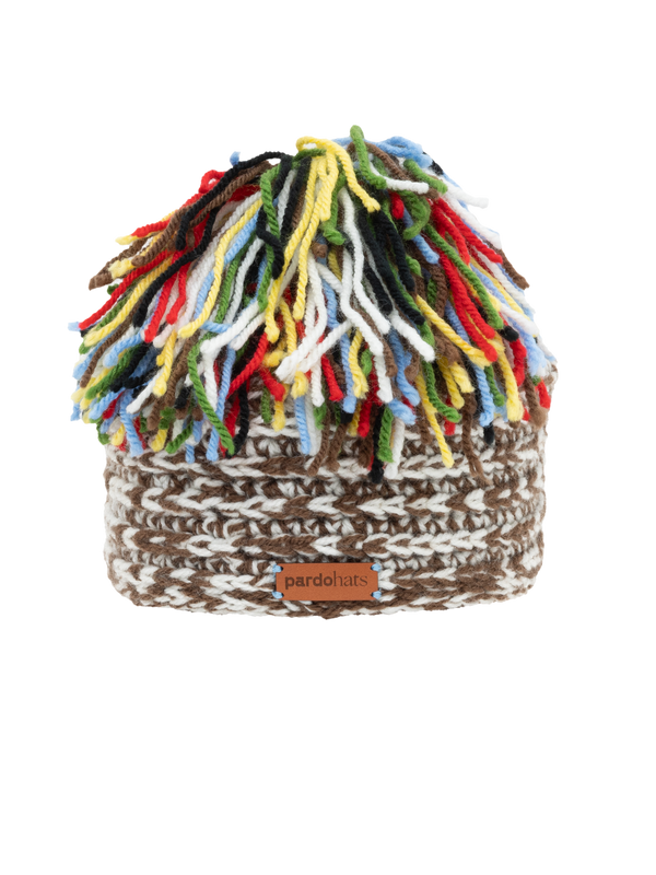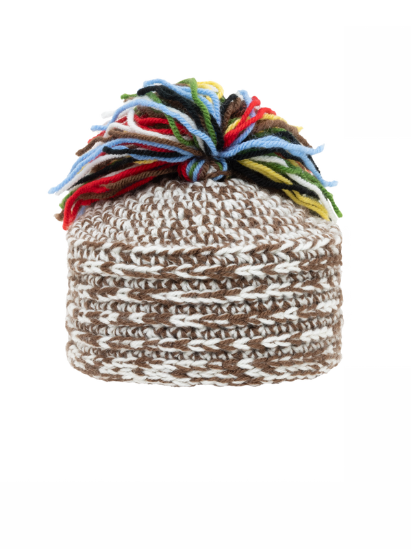 Crochet wool hat in brown and white tones, finished with a vibrant multicolor pompom.