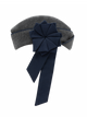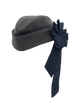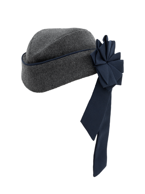 Grey wool hat accented with a sculptural navy origami flower and matching ribbon detail.