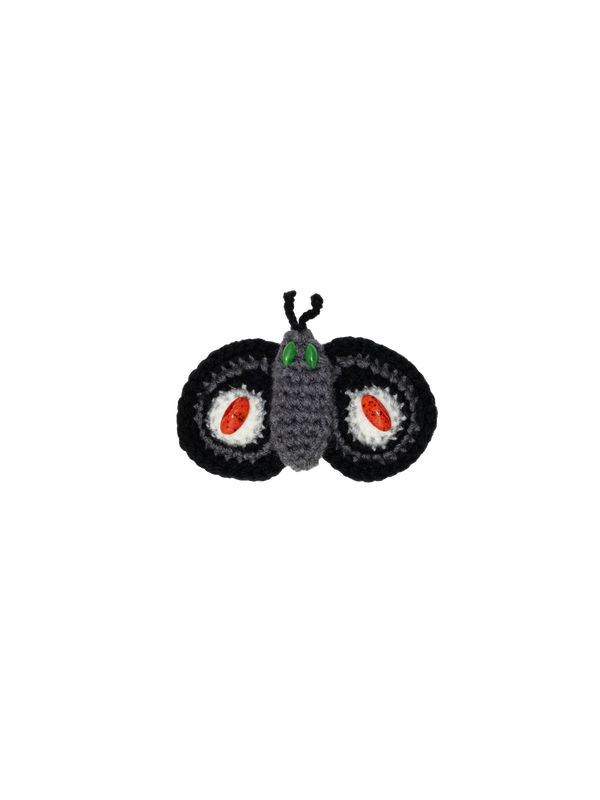 Wool hair clip in a butterfly shape with black and white tones, finished with orange and green vintage synthetic beads.