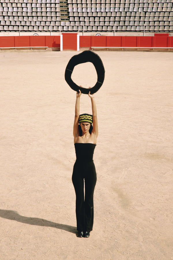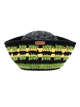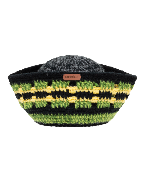 Crochet wool hat with green and yellow geometric pattern, outlined in black for bold contrast. The wide brim allows you to shape it to your style.