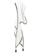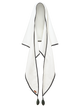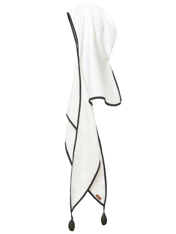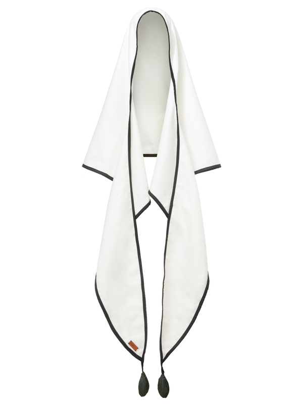 Long hood scarf in white fabric with black edging, finished with dark green tassel details at the ends.