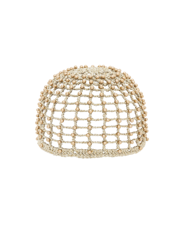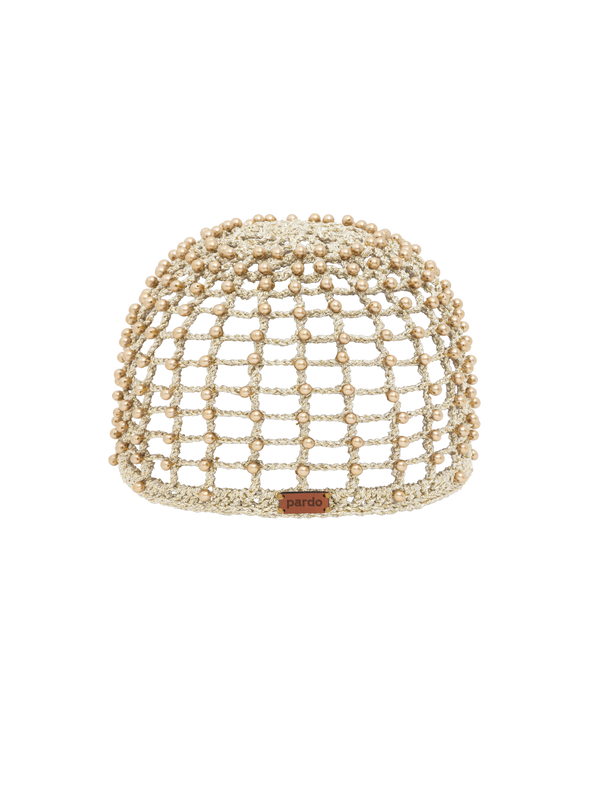 Crochet skull cap in metallic gold yarn, fully embroided with golden beads.