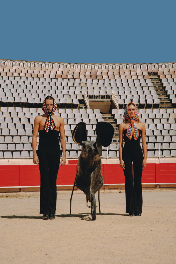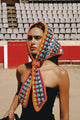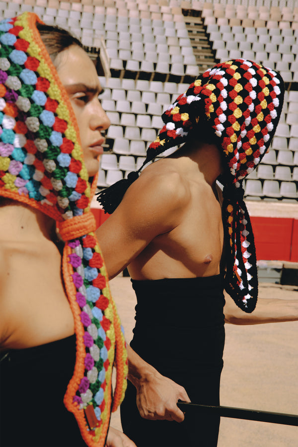 XL multicolor crochet bandana in a triangular shape, versatile enough to be worn on the head, around the neck, or styled in different ways.