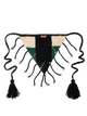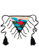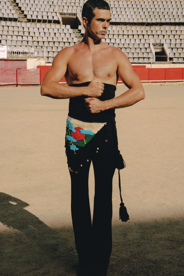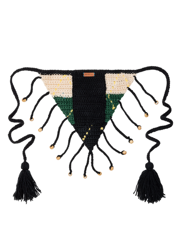 Designed to be worn as a belt, with a hidden pouch at the back, crochet triangular bandana featuring a romantic sun-and-cloud landscape, finished with black tassels and bead details.
