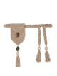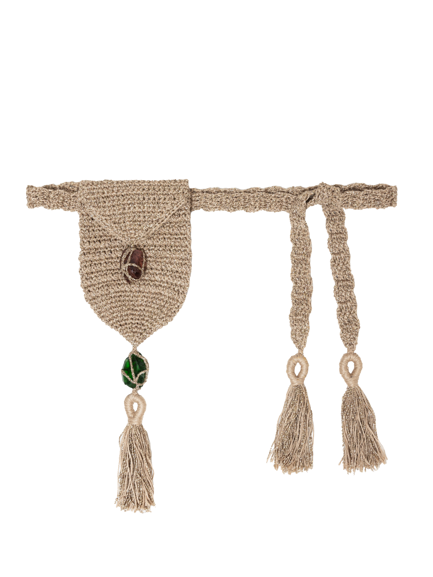 Beige linen-cotton belt with hanging pouch finished with encapsulated glass stones and pompon. The pouch is approximatively 14cm x 18cm and can be repositioned or removed, allowing you to style it your own way.