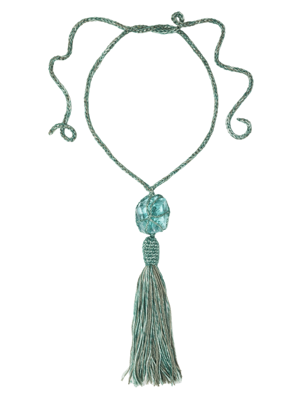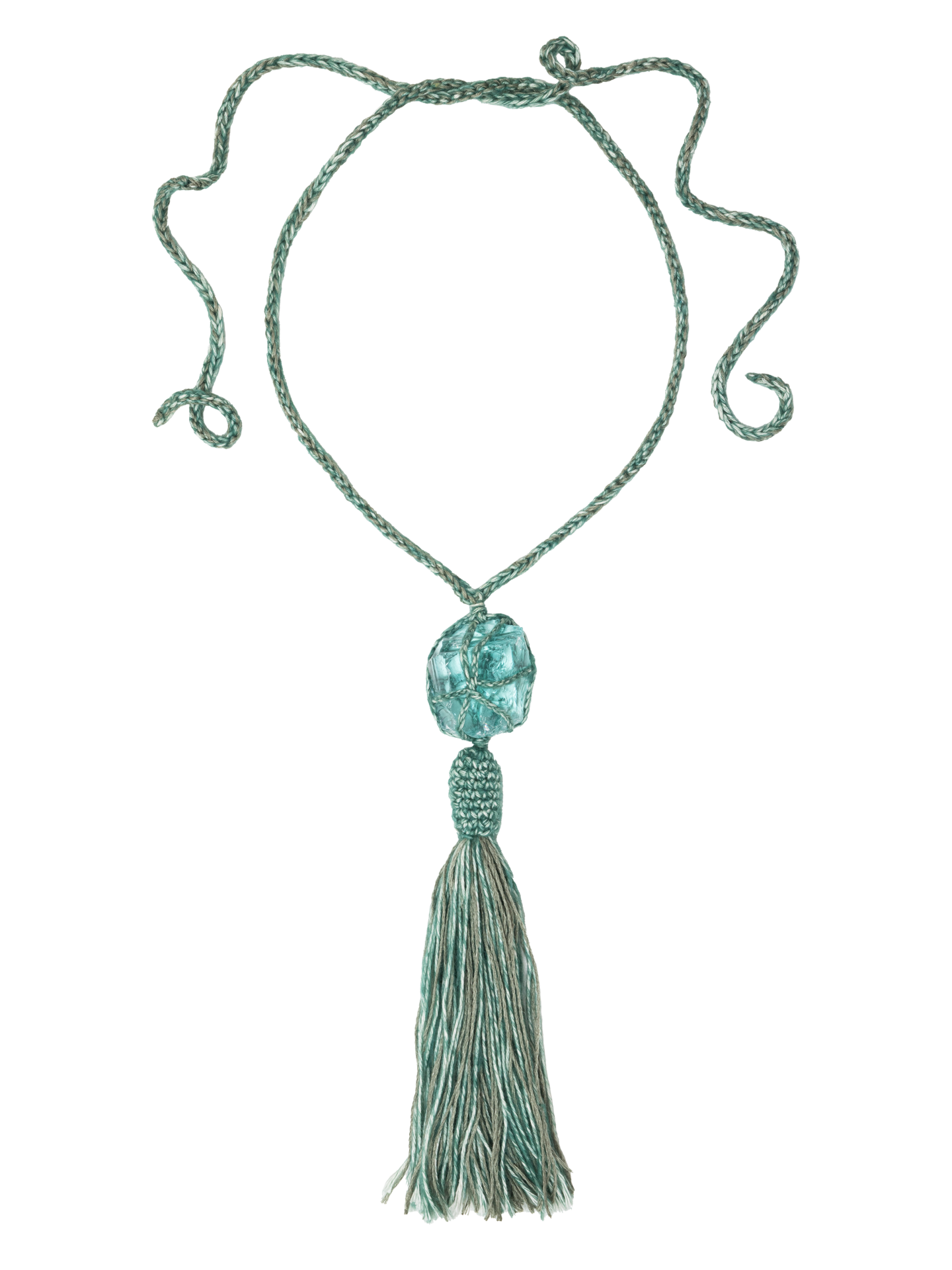 Adjustable green necklace finished with colorful glass stone and pompon, to be tied with a knot. Versatile, it can also be used either as a belt.