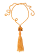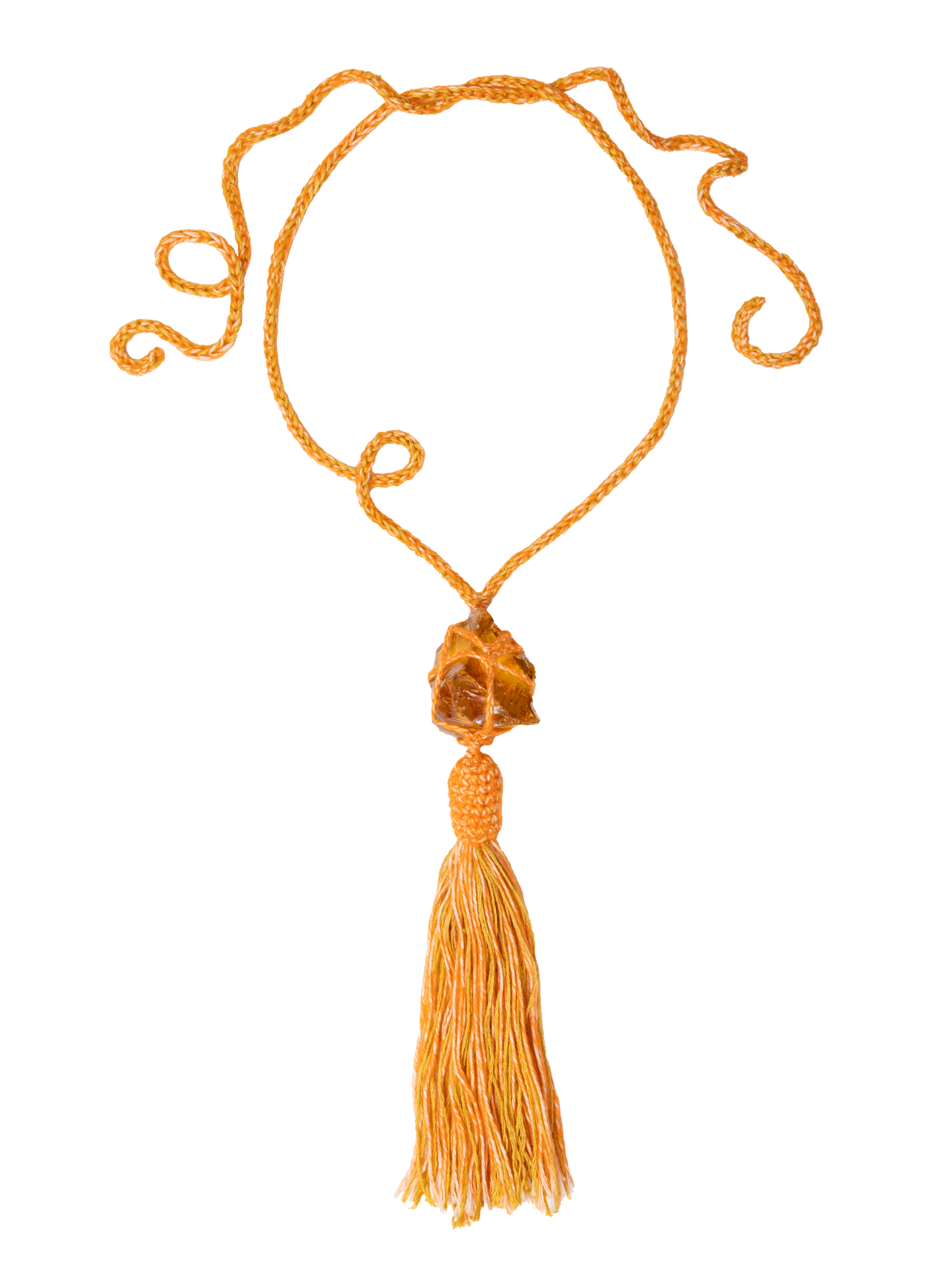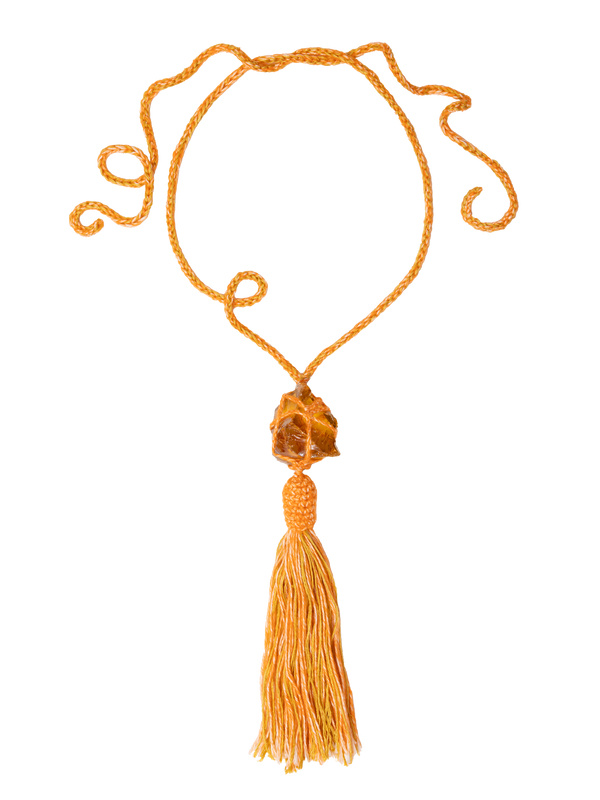 Adjustable orange necklace finished with colorful glass stone and pompon, to be tied with a knot. Versatile, it can also be used either as a belt.