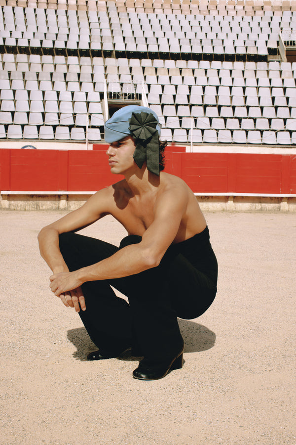 Sky blue wool hat accented with a sculptural kaki green origami flower and matching ribbon detail.