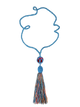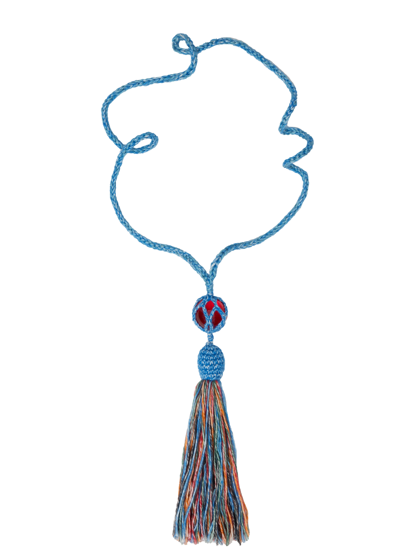Adjustable blue and multicolor necklace finished with colorful glass bead and pompon, to be tied with a knot. Versatile, it can also be used either as a belt.