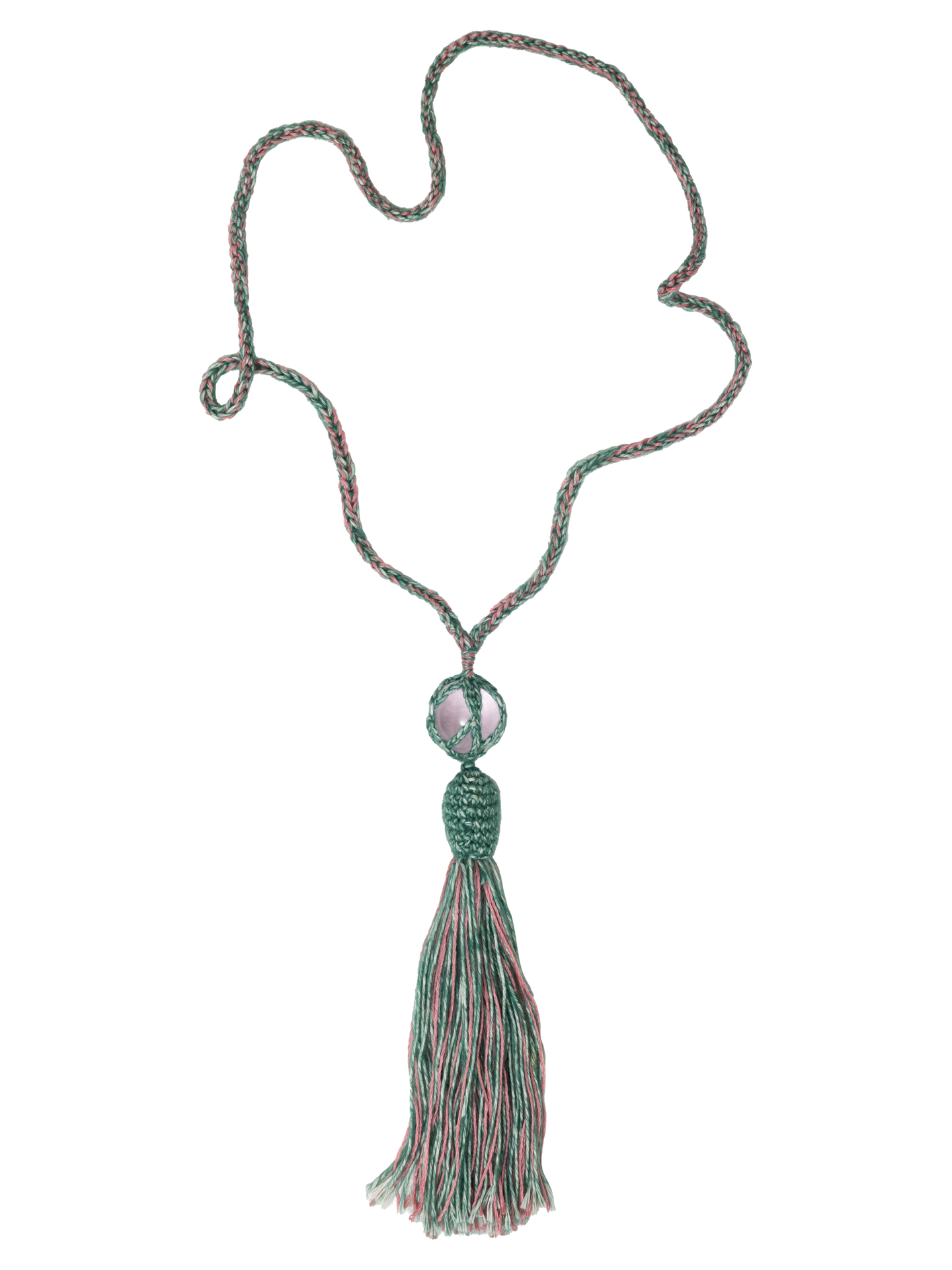 Adjustable green and multicolor necklace finished with colorful glass bead and pompon, to be tied with a knot. Versatile, it can also be used either as a belt.