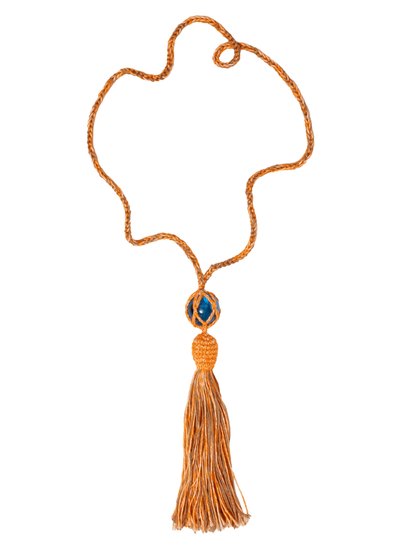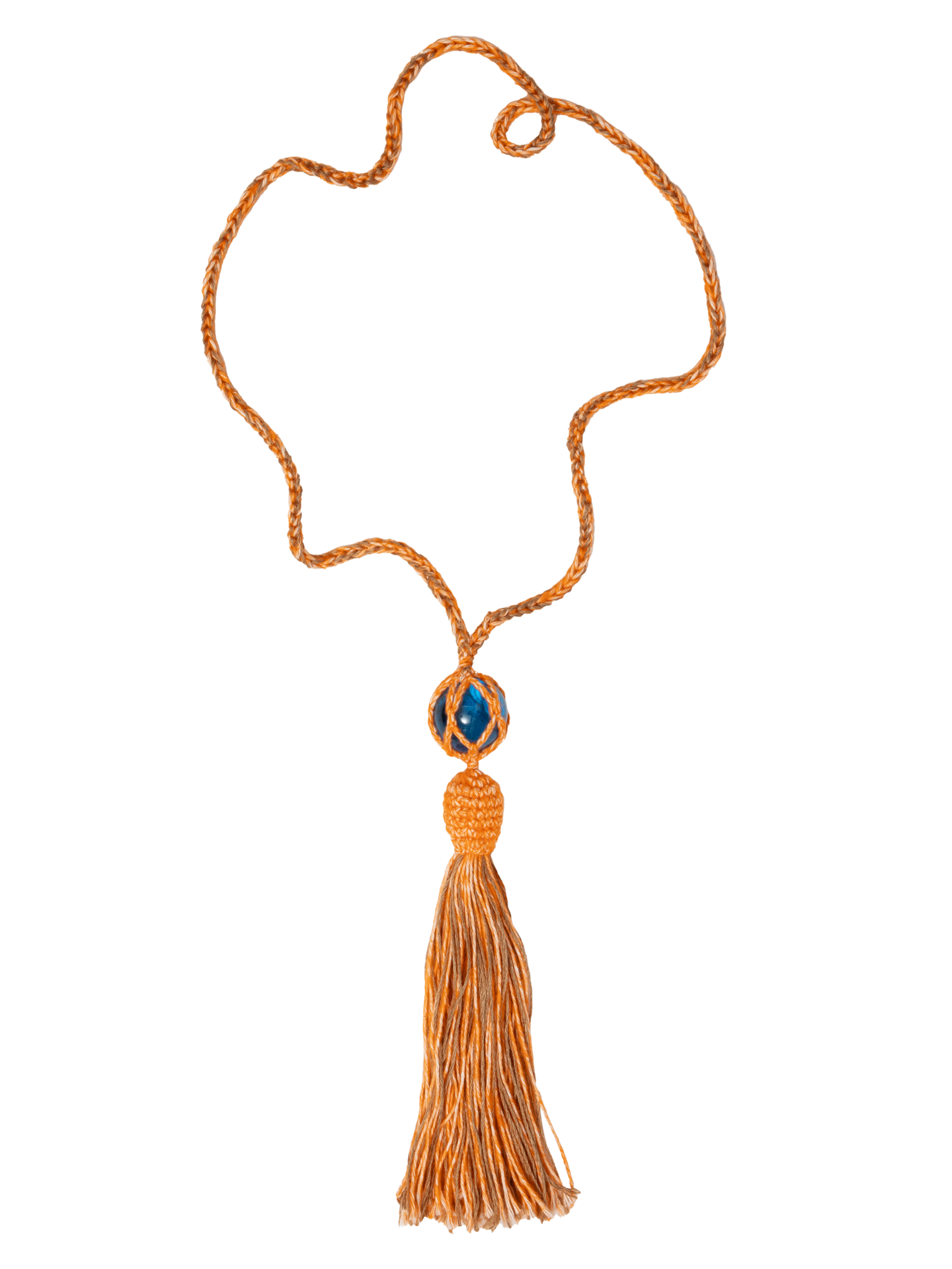 Adjustable orange and multicolor necklace finished with colorful glass bead and pompon, to be tied with a knot. Versatile, it can also be used either as a belt.