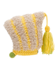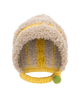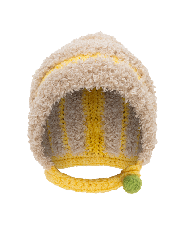 Fluffy and playful hood in yellow and beige tones, finished with a green pompom . Made with top-grade exclusive synthetic fabric that guarantees both softness and warmness.