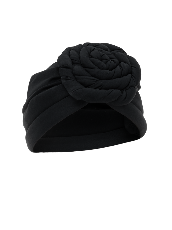 Elegant black turban crafted with padded folds, topped with a sculptural rose detail.