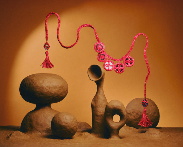 Red linen-cotton belt with mirrors, finished with encapsulated glass stones and pompons. To be tied with a knot.