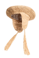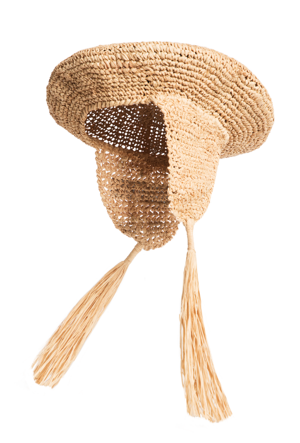 Handmade upon order in Barcelona, the Boina Colina is a handwoven raffia beret that features charming ear flaps and playful tassels—a captivating blend of Mediterranean and Andean cultures.