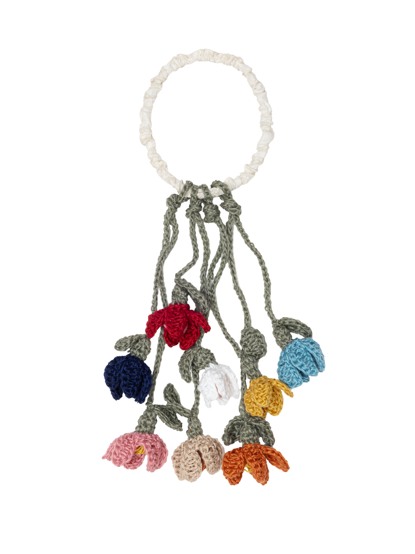 Versatile multicolor crochet flower scrunchie in linen with a wild satin finish, also wearable as a bag charm.