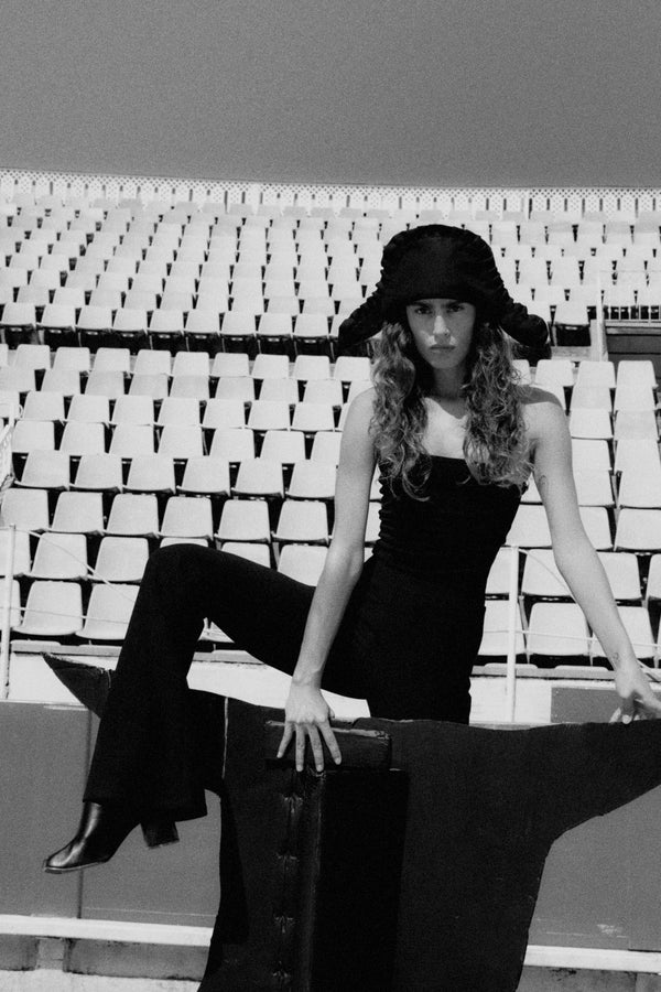 Structured bicorne-style hat in black sarga with a ruffled edge finish.