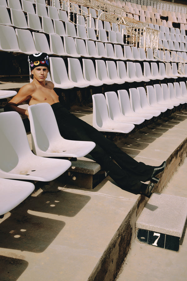 Crochet hat in black and white spiral and stripes, pattern, adorned with colorful circular mirrors.