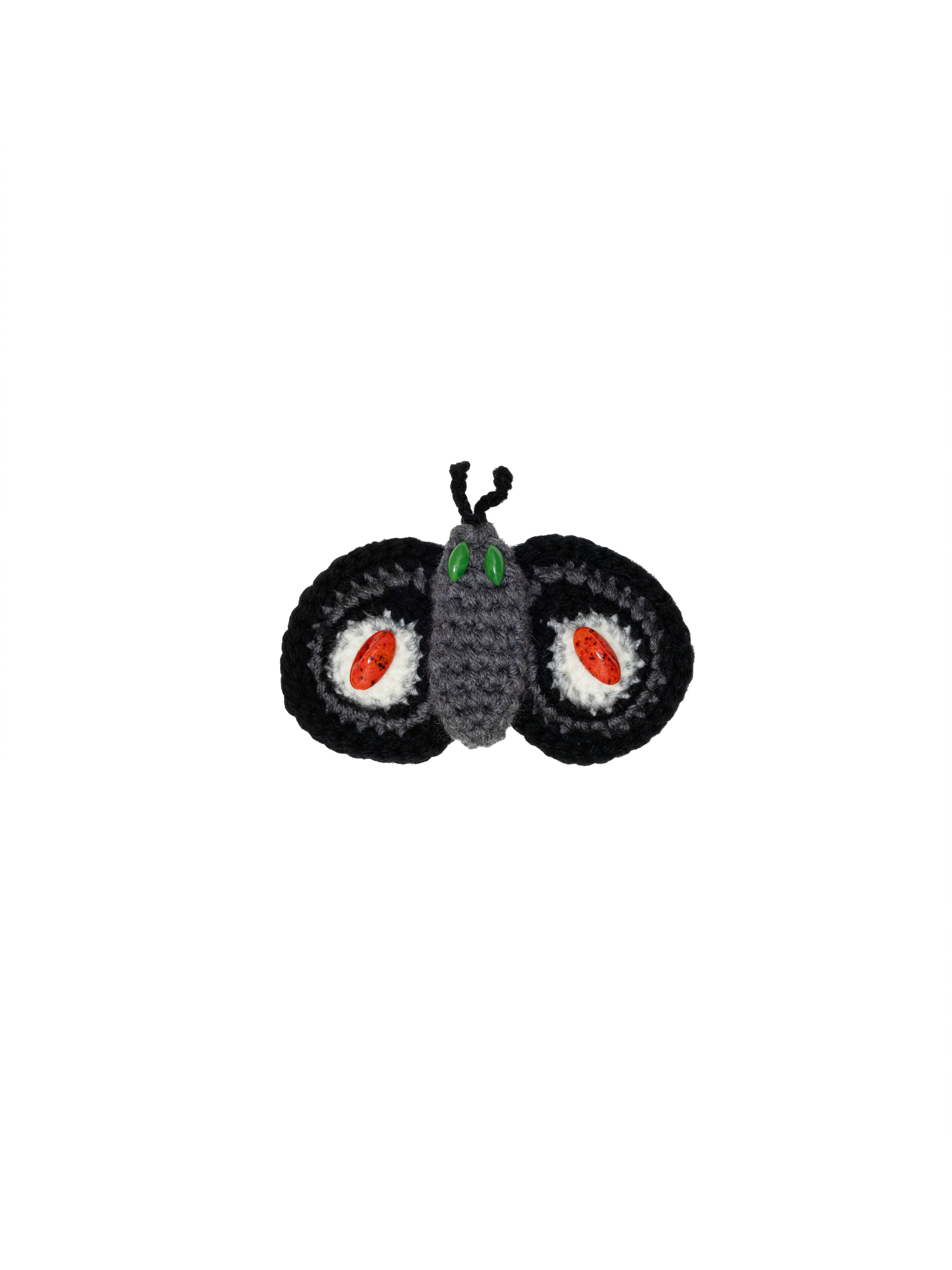 Wool hair clip in a butterfly shape with black and white tones, finished with orange and green vintage synthetic beads.