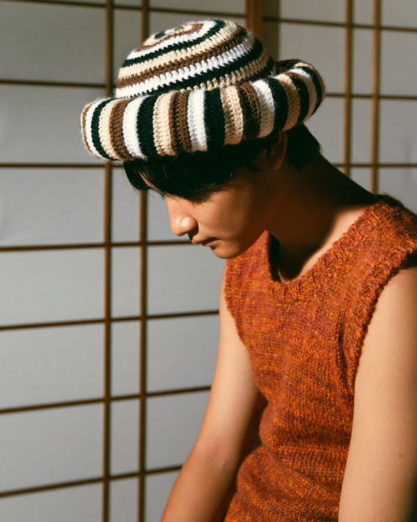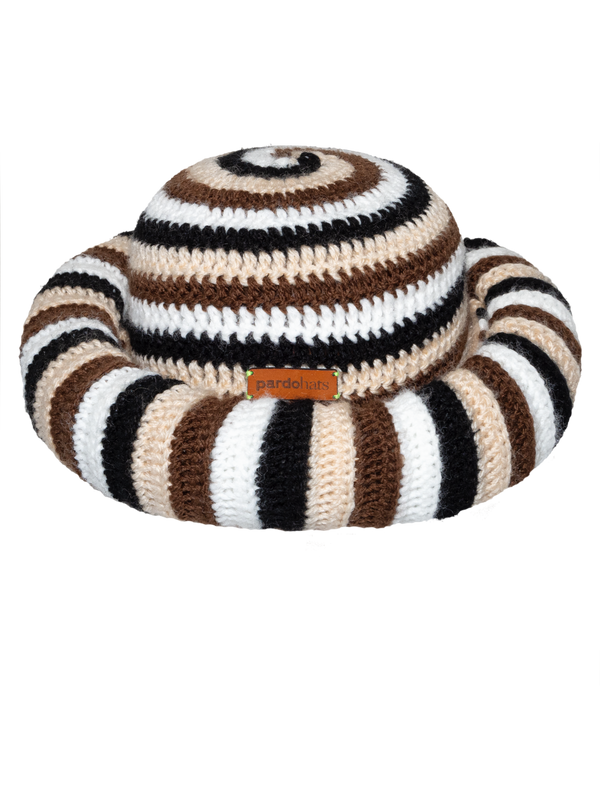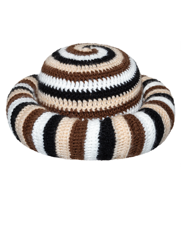 Handmade upon order in Barcelona, the Serpiente knitted crochet hat is a versatile accessory that beautifully balances fashion and functionality. This exquisite hat features a charming design adorned with white, brown, beige, and black stripes, offering a timeless and cozy appeal that is perfect for any winter outfit.