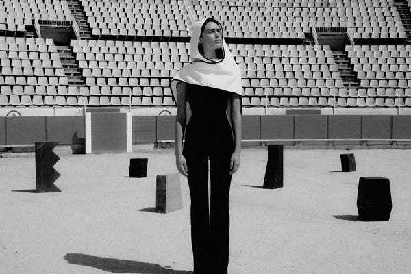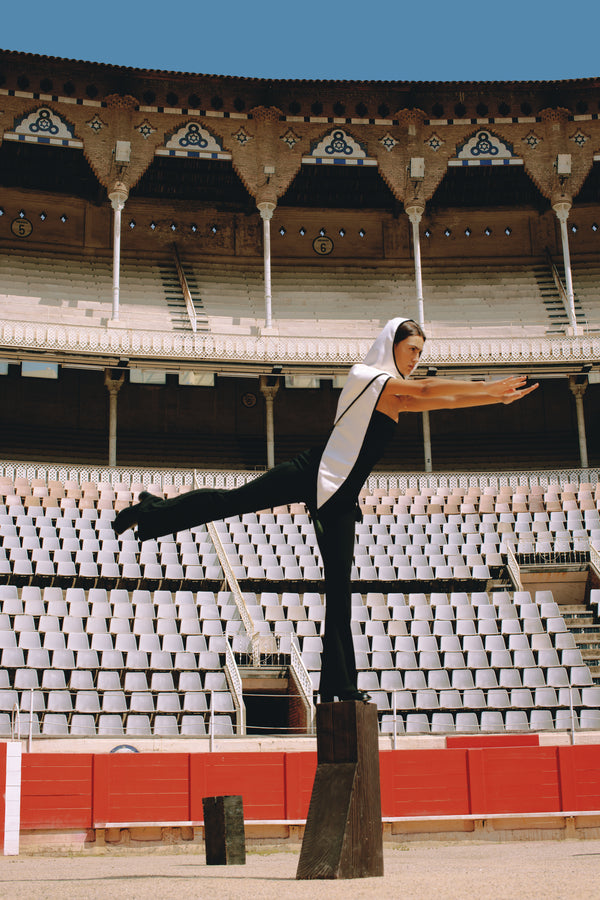 Long hood scarf in white fabric with black edging, finished with dark green tassel details at the ends.