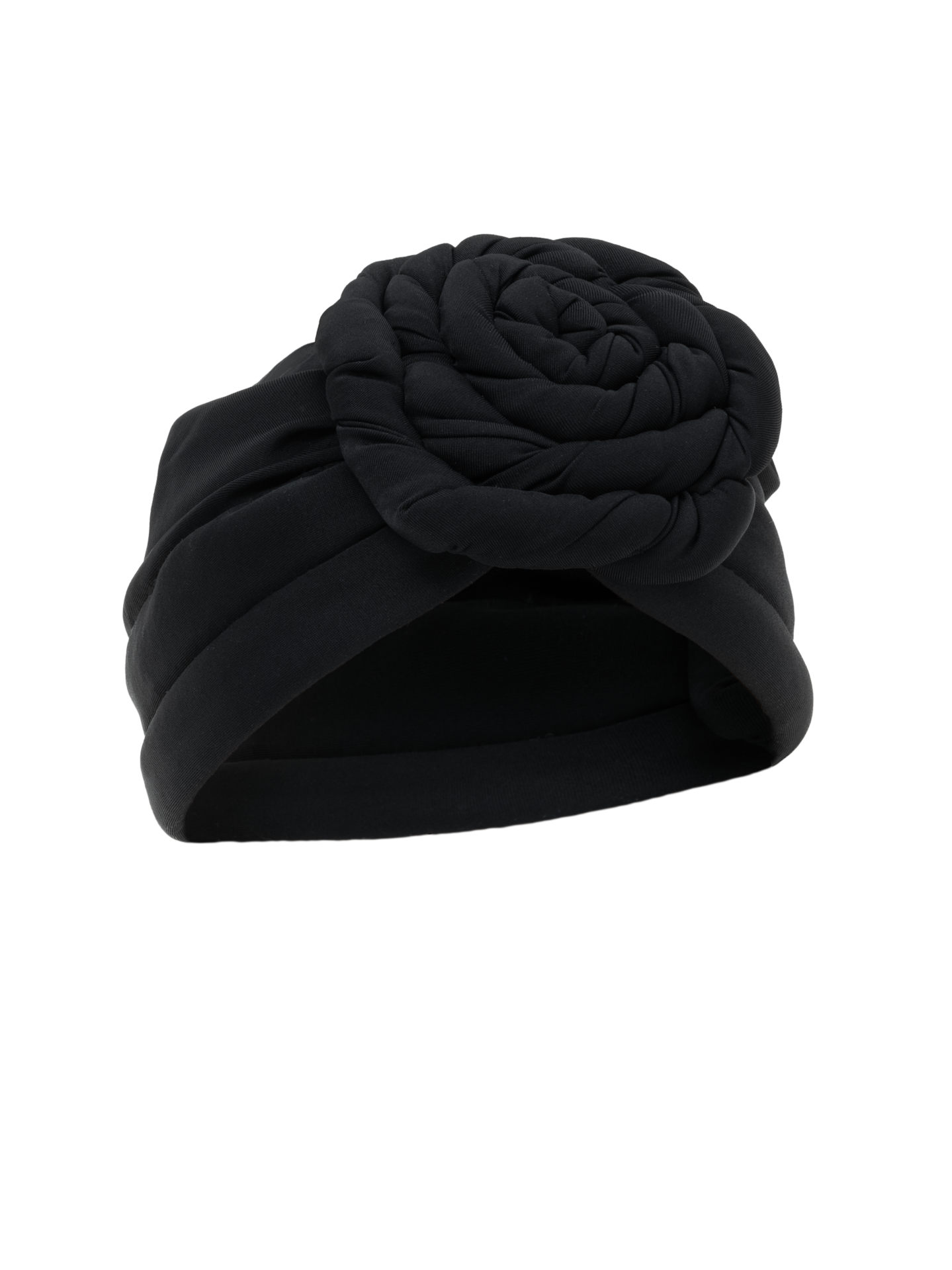 Elegant black turban crafted with padded folds, topped with a sculptural rose detail.
